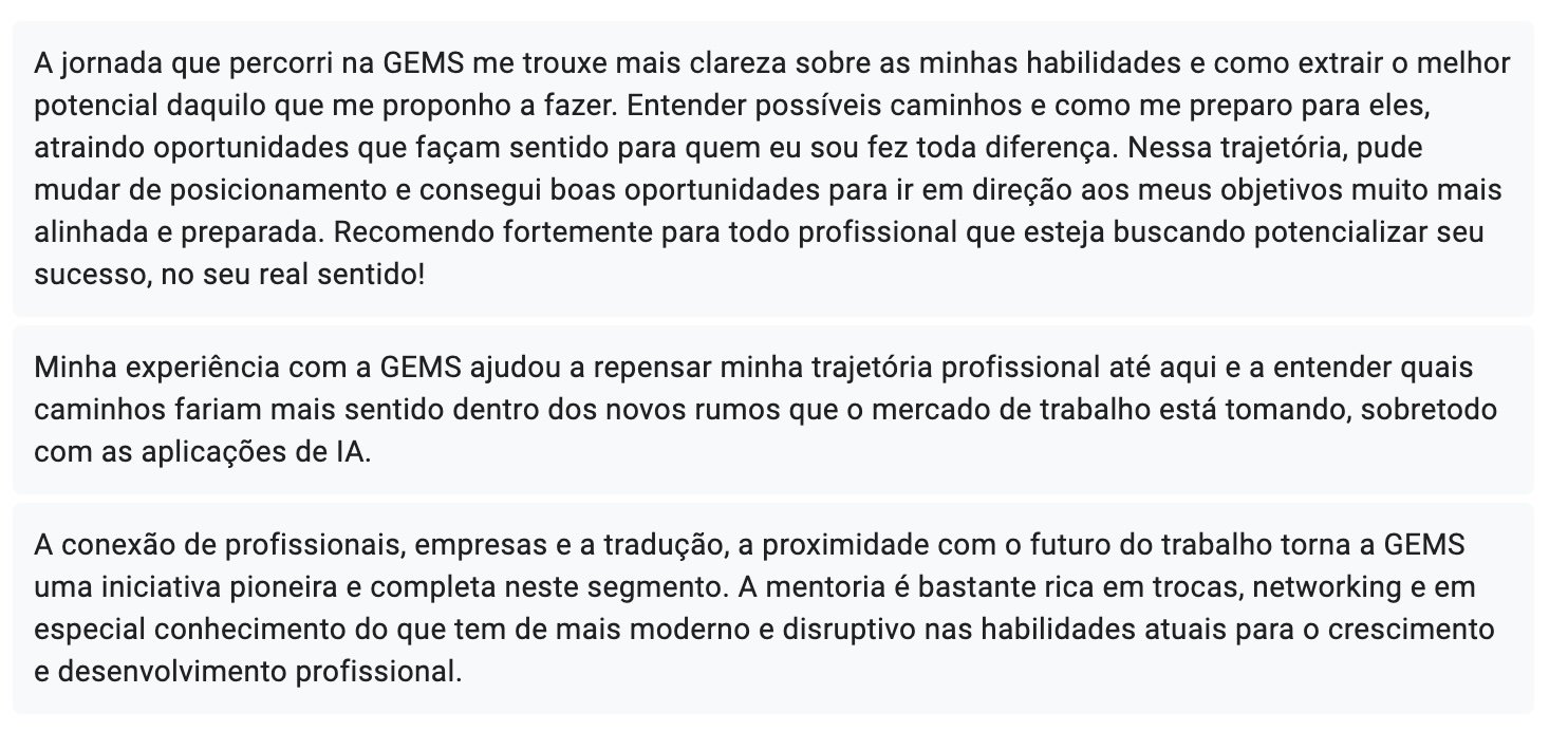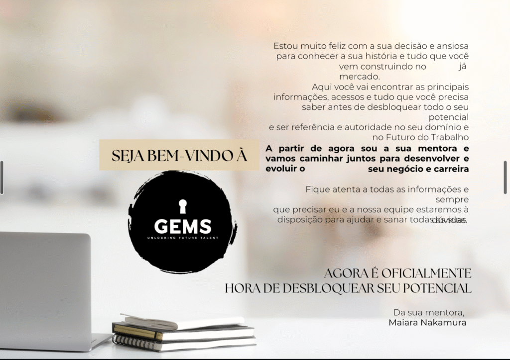 A GEMS é uma consultoria especializada em posicionamento de carreira e aquisição de talentos para a nova economia. Oferecemos mentorias, produtos digitais e soluções personalizadas para profissionais, empreendedores e empresas que desejam crescer com inteligência, marca pessoal e habilidades do futuro.